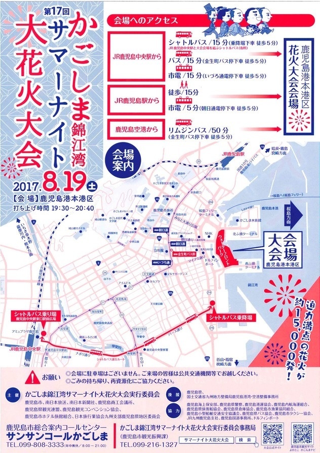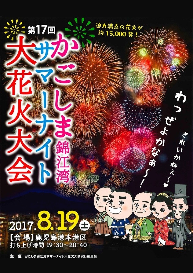 2017年 かごしま大花火大会・8月19日開催!今年も見に行くよ! かごしま大花火大会・8月19日開催! 支度はできた。。今年も見に行くよ・・「ム-」+「ミミ」+「タン」その他大勢・・ 今年のポスター・維新の役者勢揃い